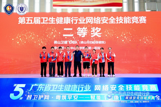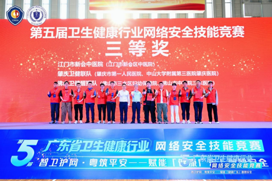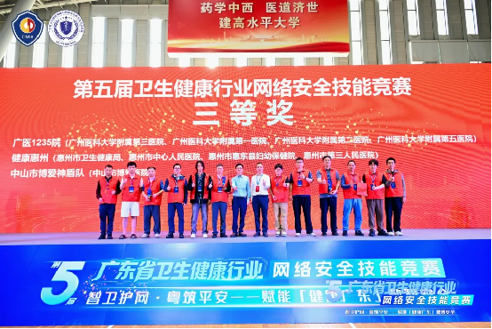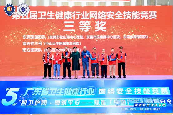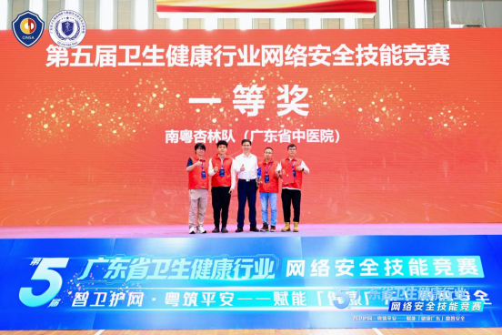 经过6小时的紧张激烈角逐,现场完成成绩核算及选手提交工作后,比赛最终结果正式揭晓:南粤杏林队获一等奖;南三南皮联队、佛山卫健有为队、佛山卫健飞鸿队、和中大附一共四支队伍荣获二等奖;江门市新会中医院、肇庆卫健联队、佛山卫健醒狮队、广医1235院、健康惠州、中山市博爱神盾队、东莞医信联队、南天柱三号和南方医院队共9支队伍荣获三等奖。广东省卫生健康委员会副主任易学锋、副处长王金龙、二级调研员张史彬、深圳市网安计算机安全检测技术有限公司副总裁石松奇、医药信息工程学院院长蔡永铭、奇安信科技集团股份有限公司广东特区文教卫负责人李双喜、广东省计算机信息网络安全协会会长杨洋、联通数智医疗科技有限公司总经理高伟等领导及各单位相关负责人分别为获奖队伍颁奖,对获奖选手的优异表现表示祝贺,鼓励大家以此次竞赛为契机,持续深耕网络安全领域,锤炼过硬本领。